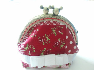 Porta moedas em tecido com fecho metálico e aplicação de fita e laço.